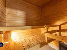 - Kuvaus: Seinät ja katto puupaneeli, lauteet, laattalattia, sähkökiuas, lasiovi, lämpöpatteri.