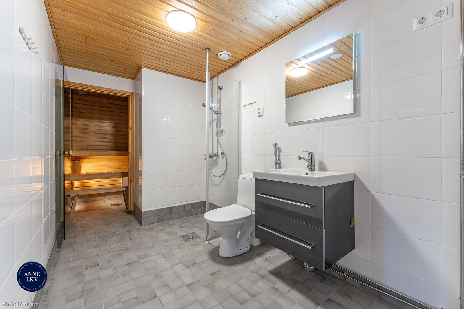 Tilava kylpyhuone ja oma sauna tuovat asumiseen mukavuutta - saunan voit lämmittää juuri silloin kun haluat.