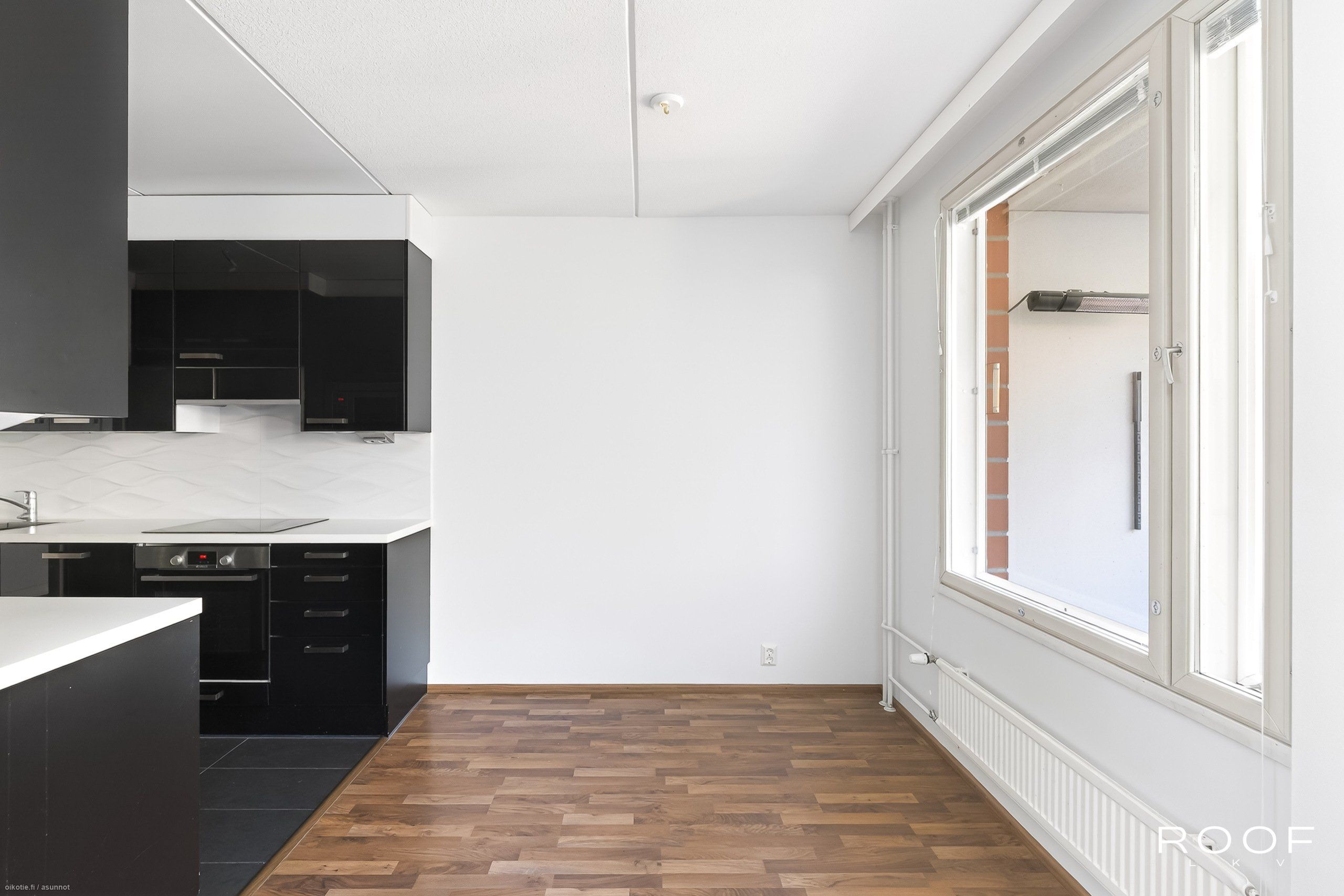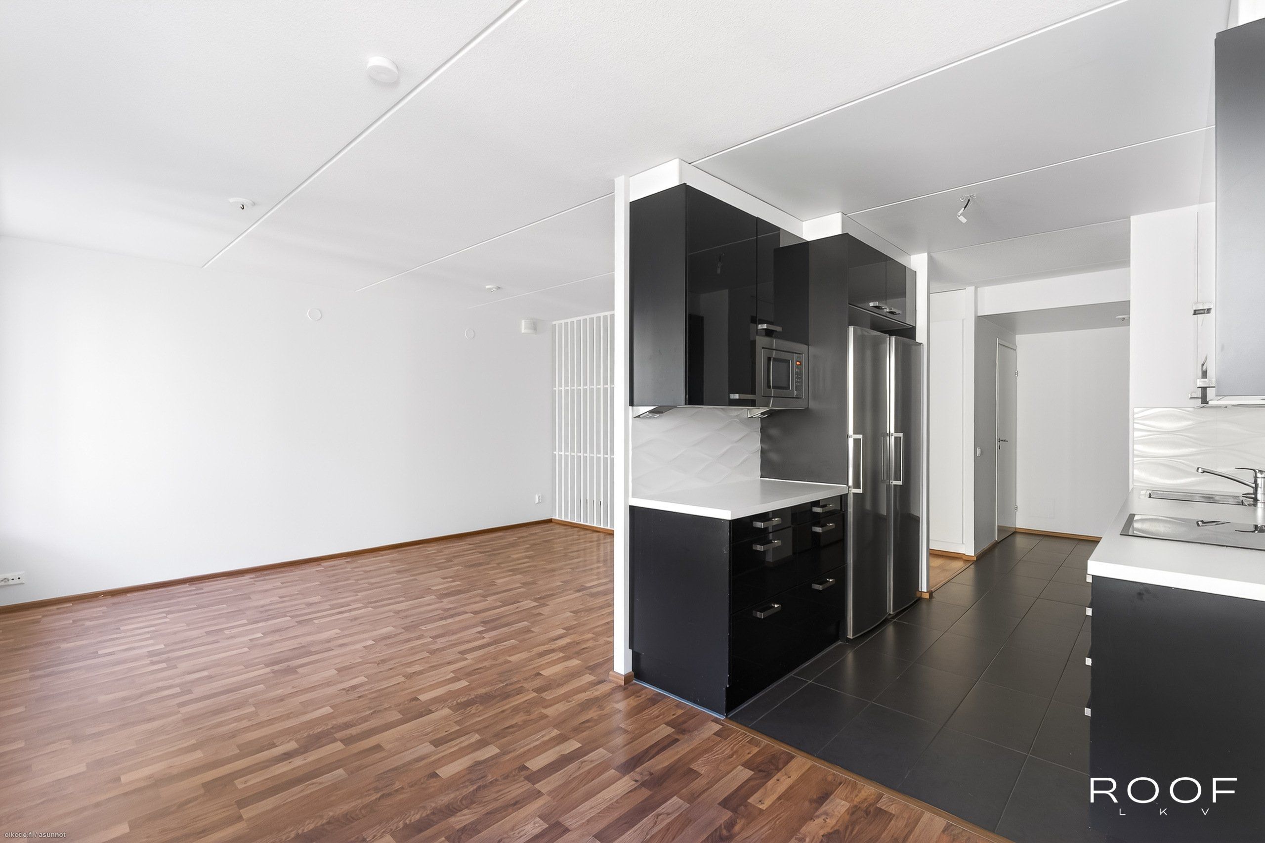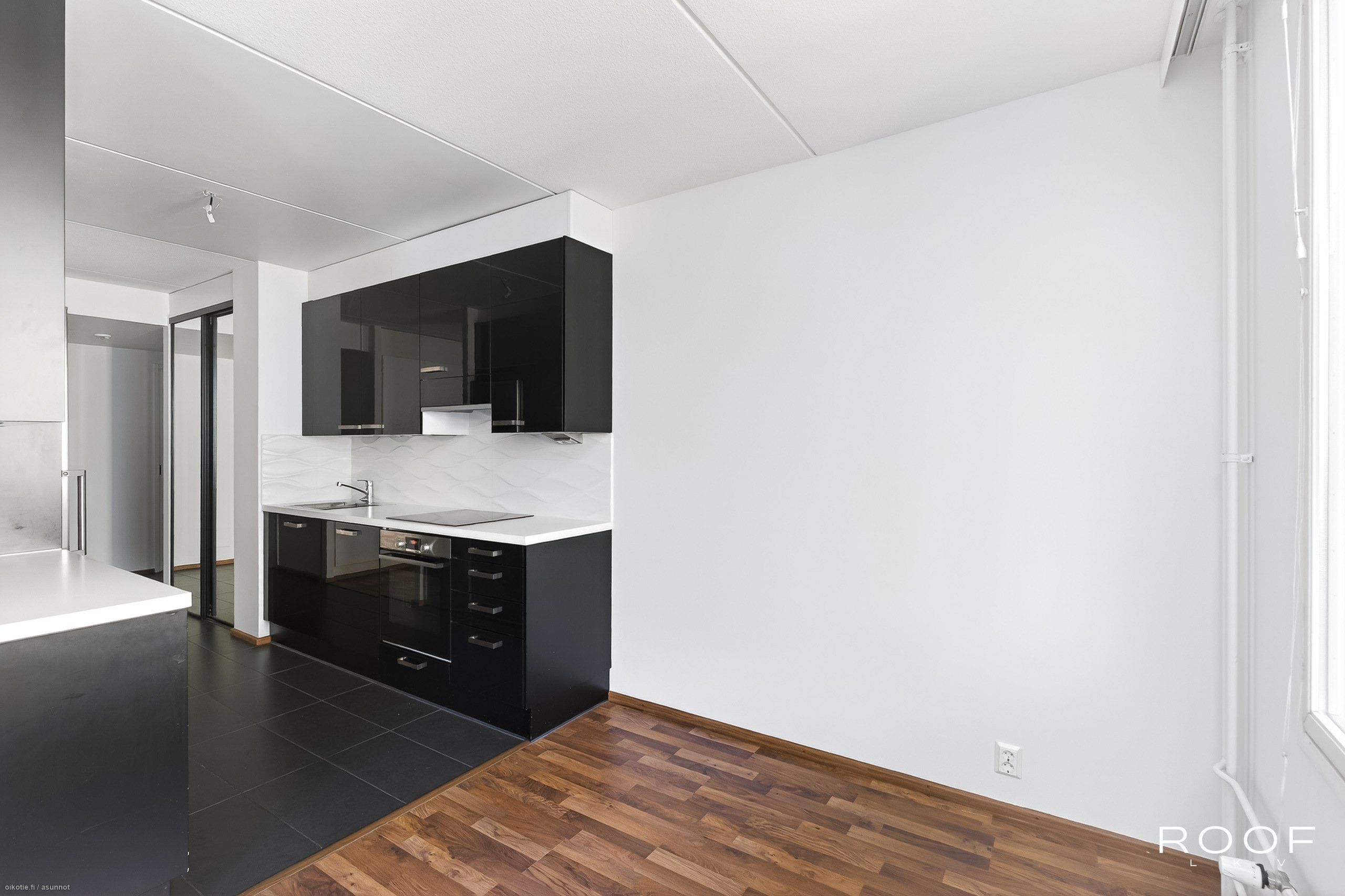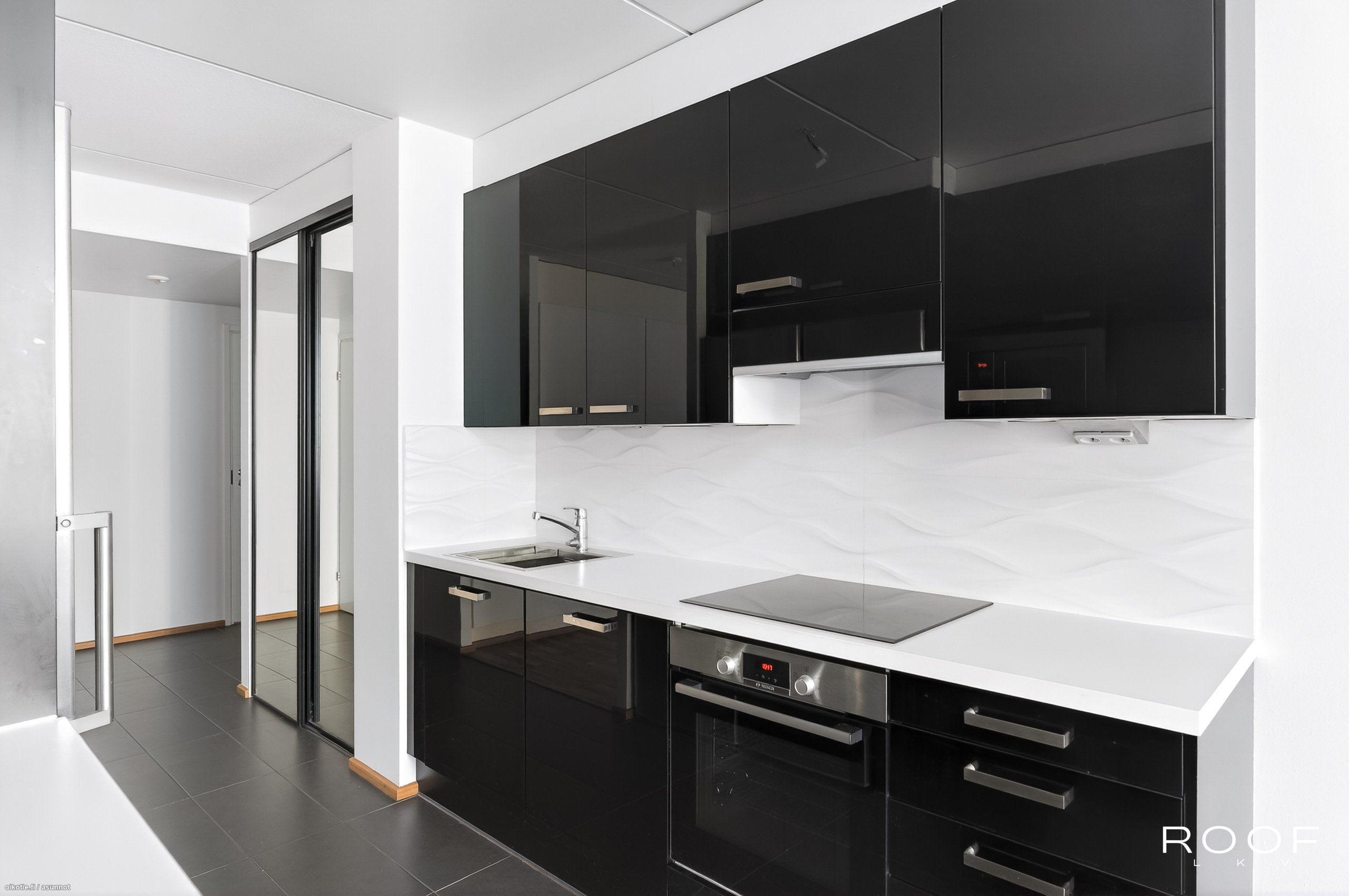 - Keittiön varusteet: Erillinen pakastin, liesi, liesituuletin, mikroaaltouuni, astianpesukone ja jääkaappi. Liesi: Induktioliesi. Työtason materiaali: Laminaatti. Korkeakiiltoinen, tyylikäs musta-valkoinen keittiö, välitilassa valkoinen laatta, lattiassa harmaata isokokoista laattaa, joka jatkuu eteiseen.