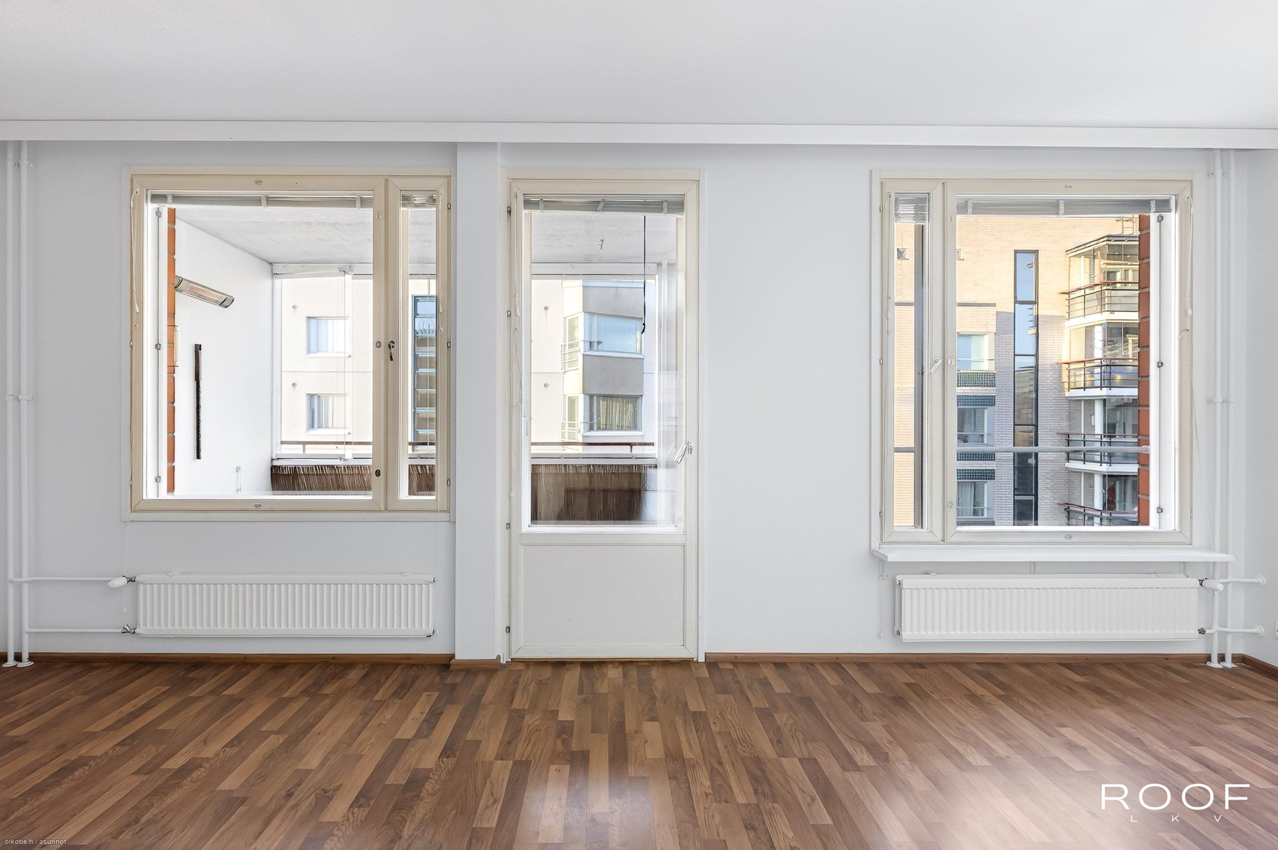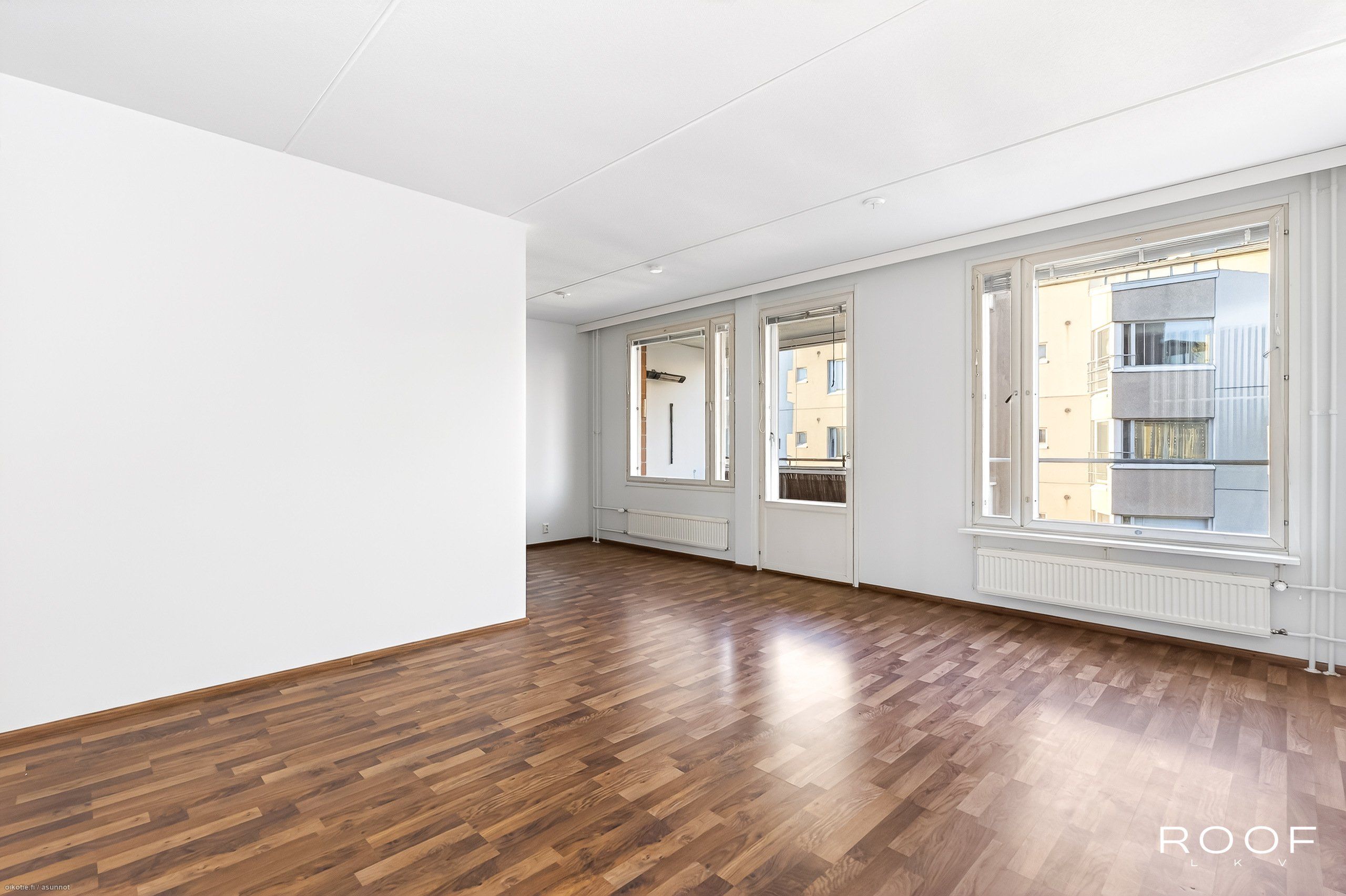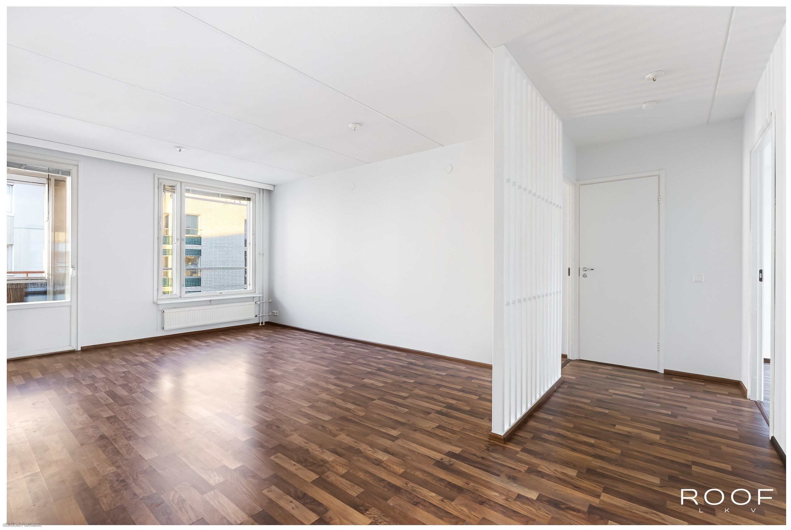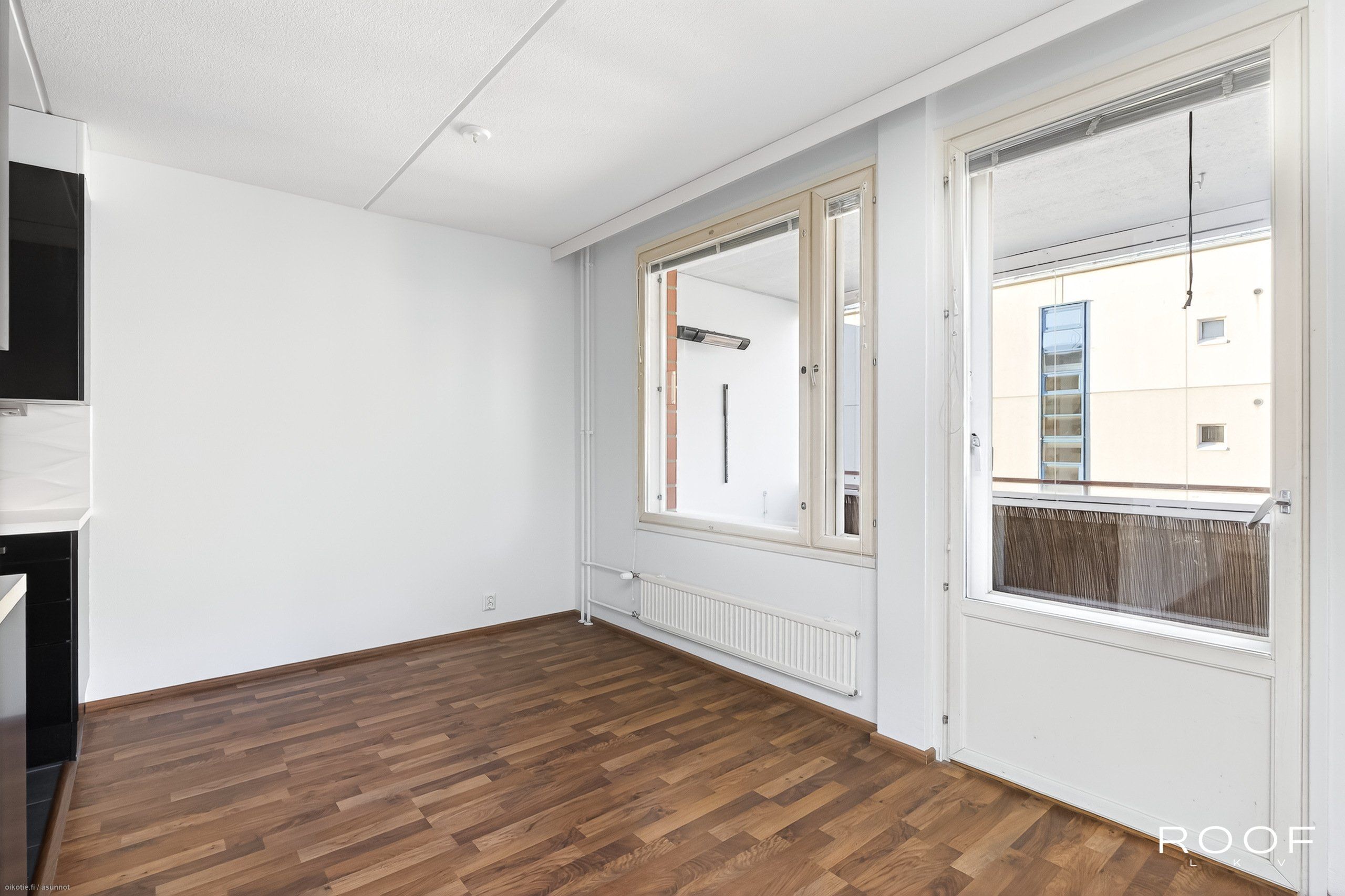 - Lattia tumman ruskeaa parkettia, seinäpintoja on tasoitettu ja maalattu v. 2025, olohuoneesta kulku tilavalle lasitetulle parvekkeelle.