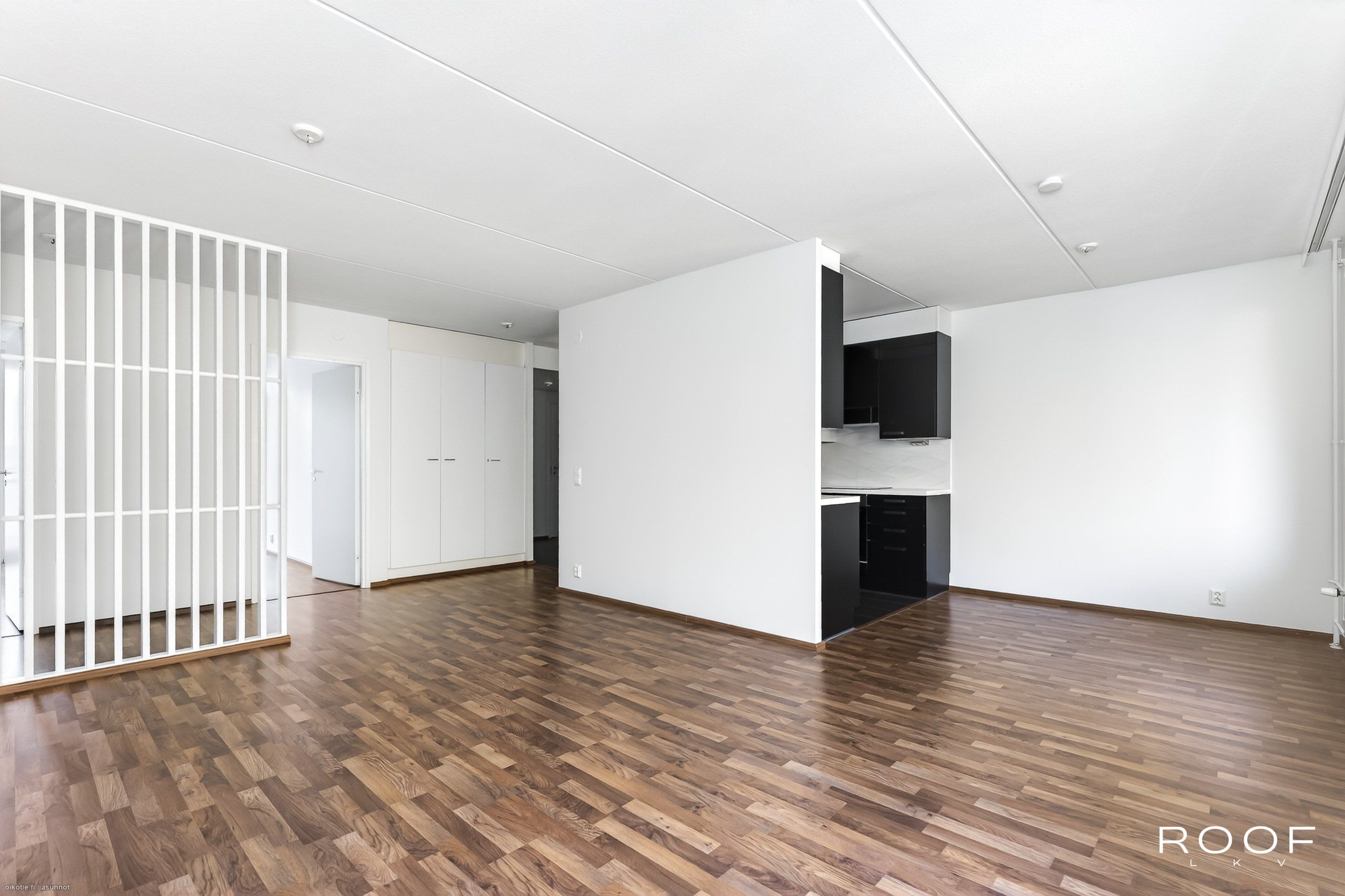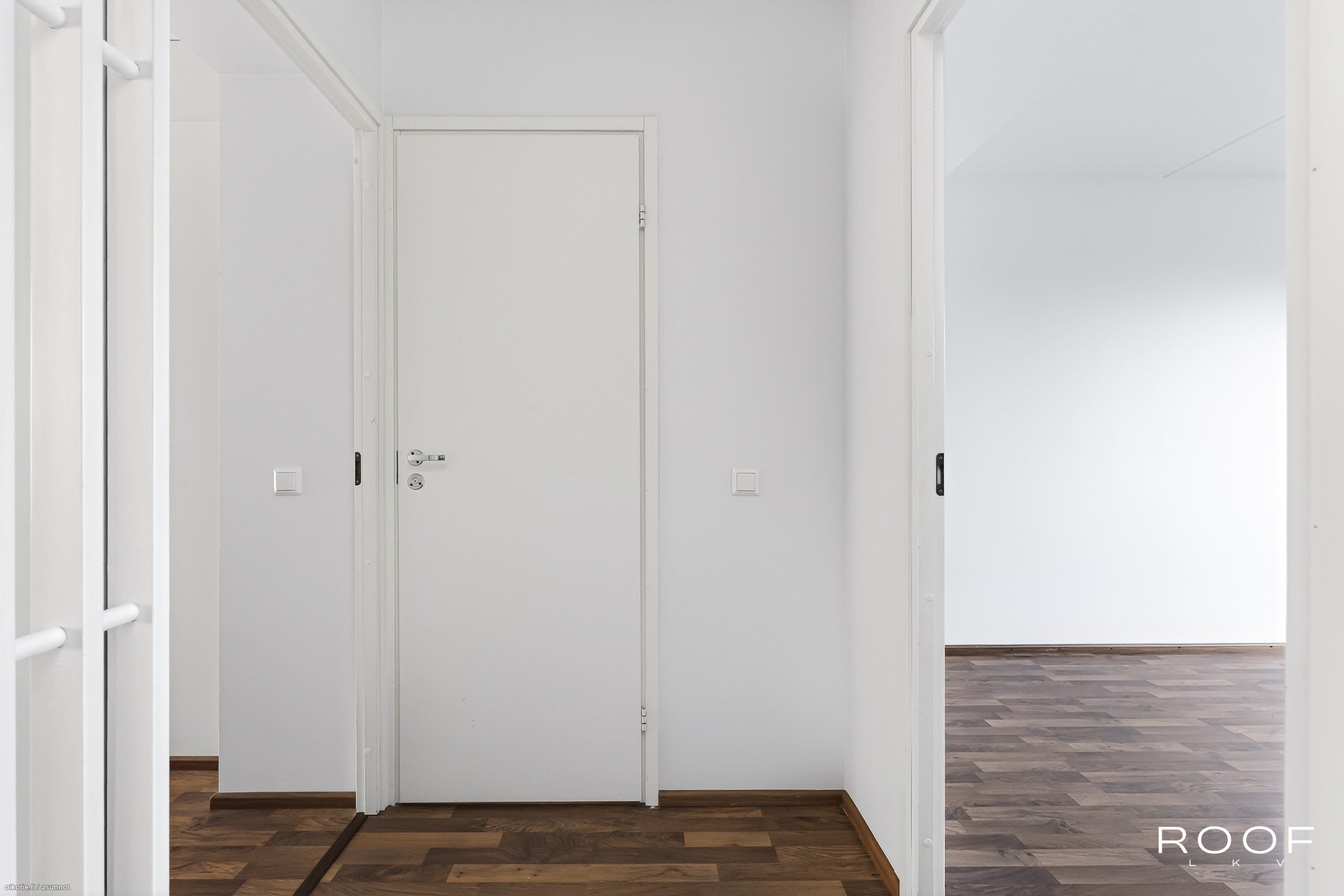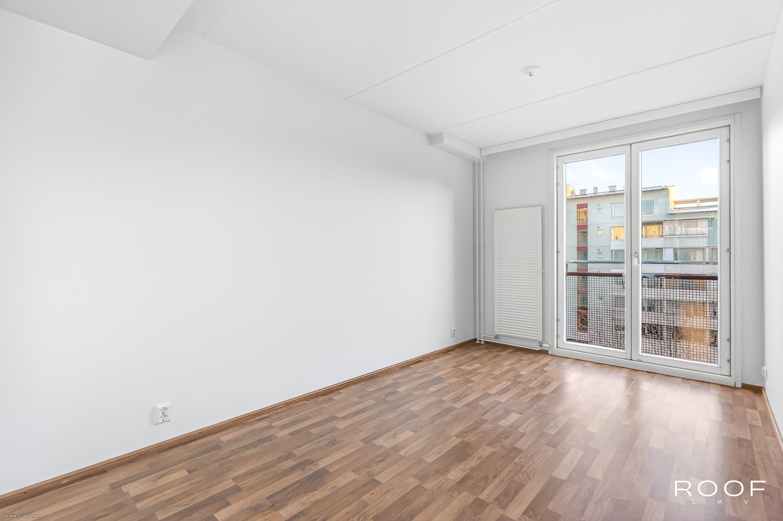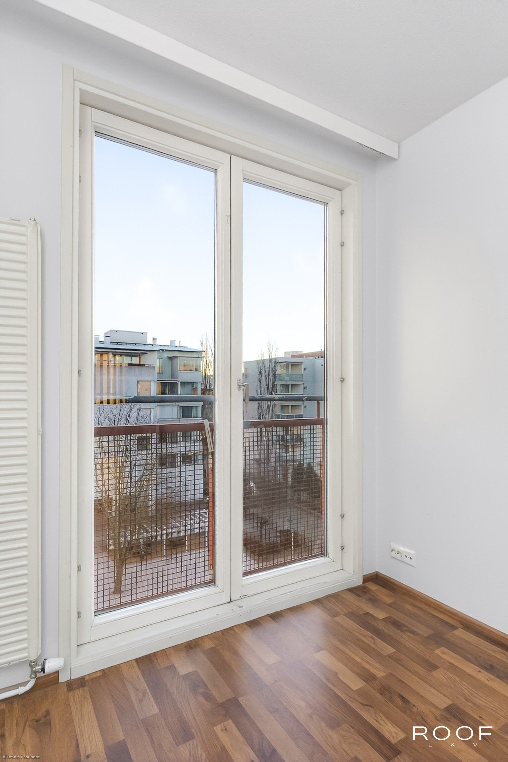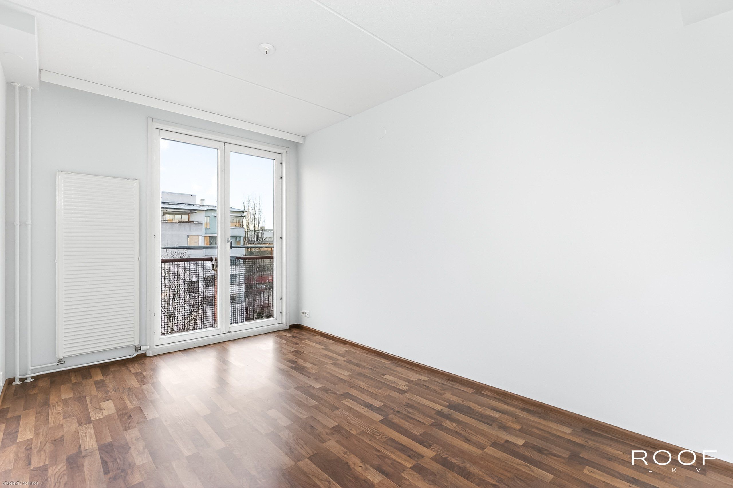 - Lattia tumman ruskeaa parkettia, seinäpintoja on tasoitettu ja maalattu v. 2025, olohuoneesta kulku tilavalle lasitetulle parvekkeelle.