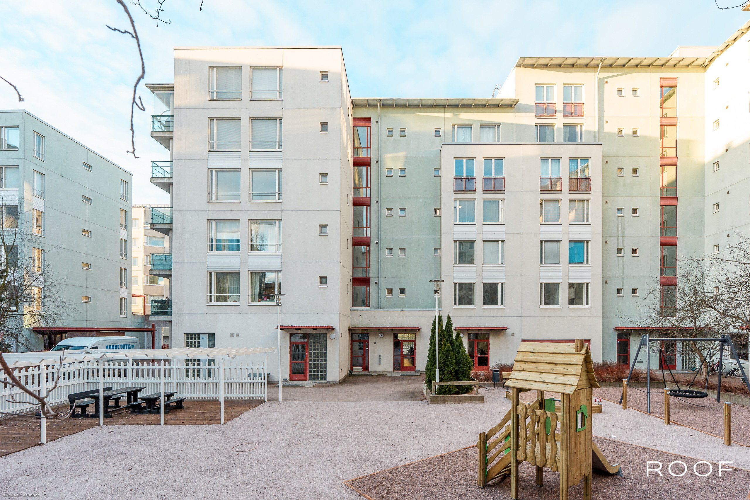 Asunnon pohjaratkaisu on toimiva ja valoisa, ja se sijaitsee 5/6 kerroksessa – talossa on hissi. Olohuoneesta on käynti lasitetulle parvekkeelle, josta on näkymät Harmajankadulle ja Ruohikseen. Kaksi ranskalaisin parvekkein varustettua makuuhuonetta avautuvat rauhalliselle sisäpihalle, jossa on vehreitä istutuksia ja leikkipaikkoja lapsille.