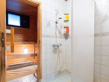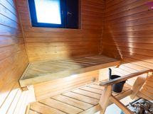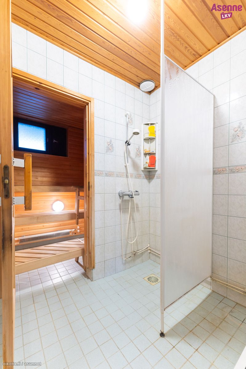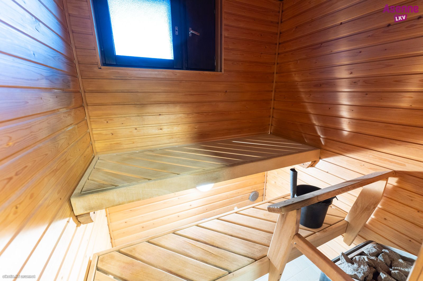 - Kuvaus: Lattia laatoitettu, seinät/katto paneloitu. Sähkökiuas, ikkuna.