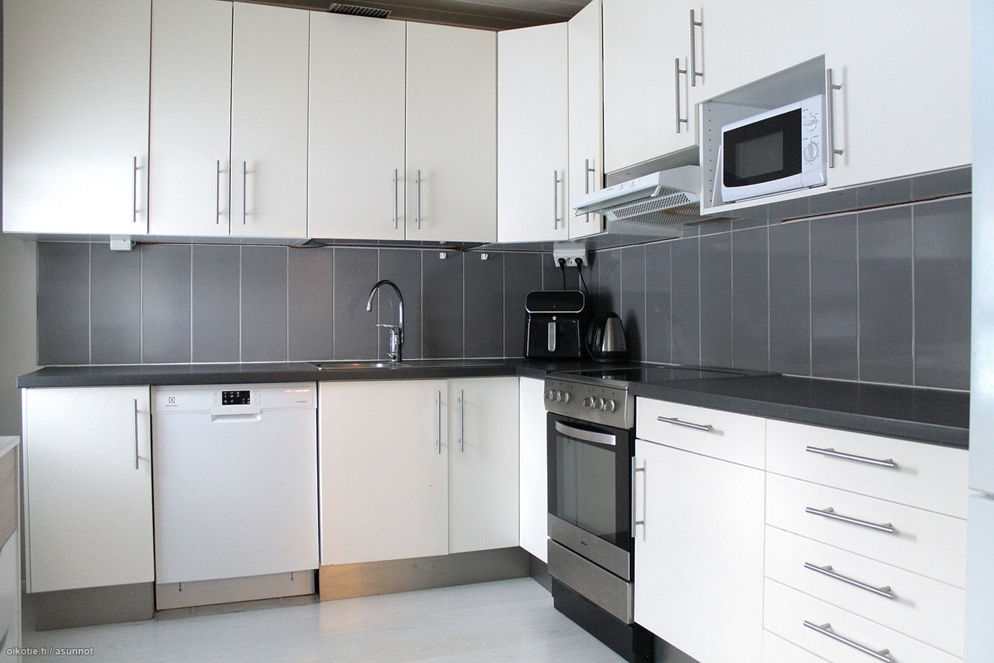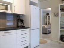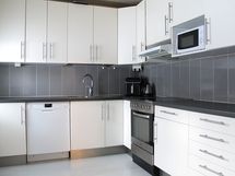- remontoitu 2010, valkoiset kaapistot, tummat laminaattitasot, jää-/pakastinkaappi, keraaminen liesi ja uuni, liesikupu/-tuuletin (aktiivihiilisuodattimella), mikroaaltouunivalmius, kiinteät valaisimet, ruokailutila ikkunan äärellä