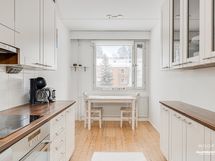 Tämän kodin sydän on ehdottomasti kaunis keittiö; täältä löytyvät päivitetyt kodinkoneet sekä ulosvedettävät apteekkarin- sekä monitoimikoneenkaapit. Tässä keittiössä on ilo valmistaa ateriat niin perheelle kuin ystävillekin!