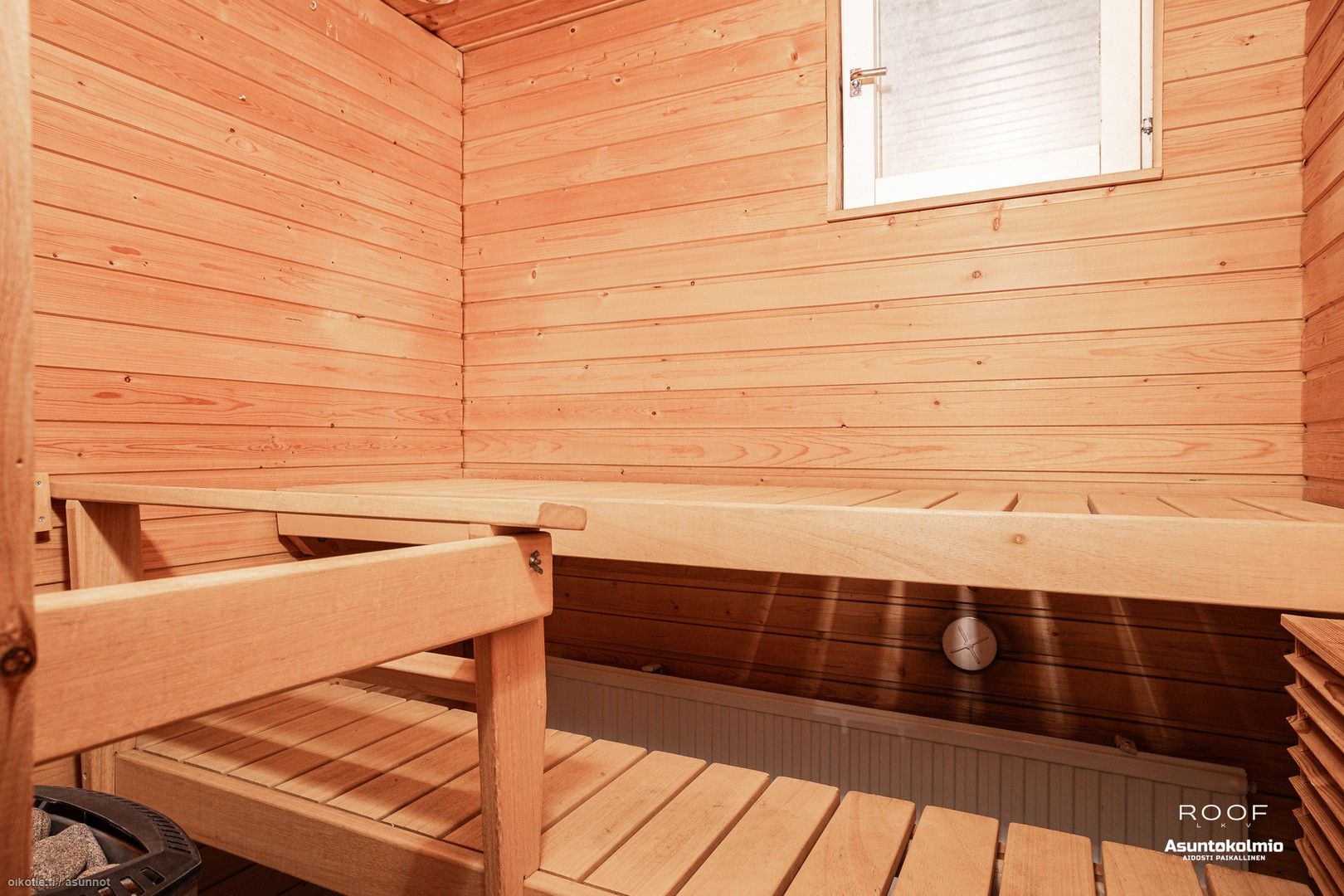 - Kiuas: Sähkökiuas. Saunassa tuuletusikkuna.