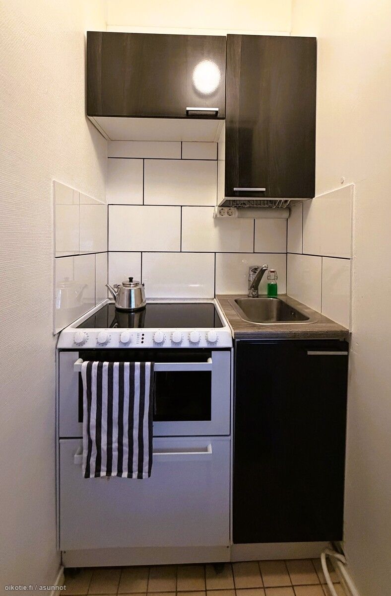 Keittokomero on harvinaisen hyvin varusteltu kokoluokkaansa nähden – käytännöllinen yhdistelmä liesi–uuni–astianpesukone sekä riittävästi kaappi- ja laskutilaa tekevät arjesta sujuvaa. Kylpyhuone on uusittu kokonaan putkiremontin yhteydessä. Kylpyhuoneessa on suihku.
