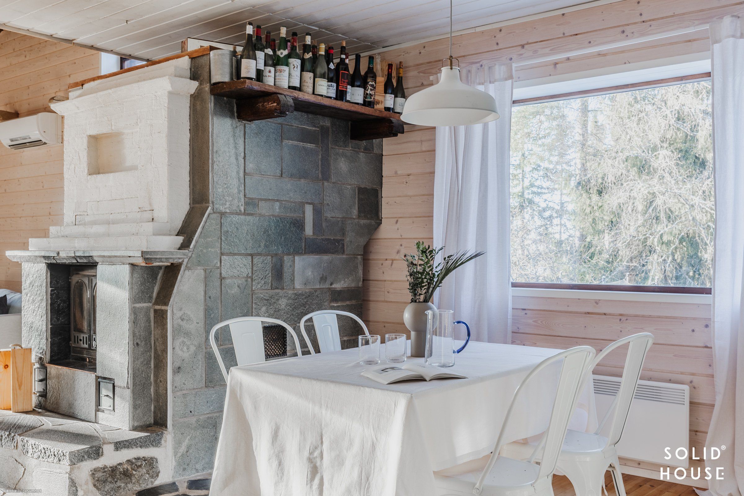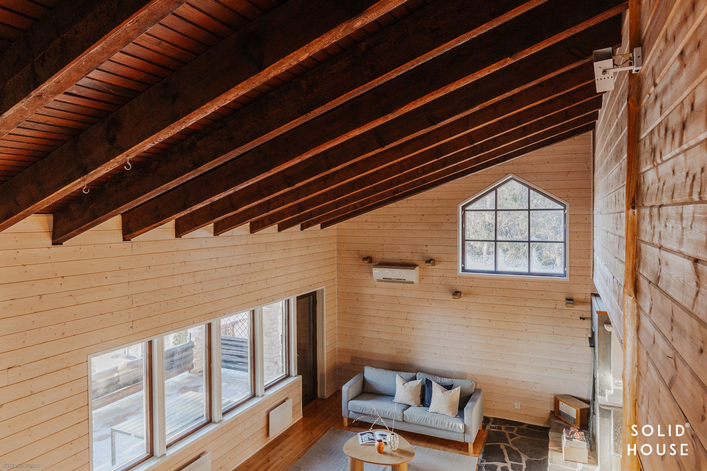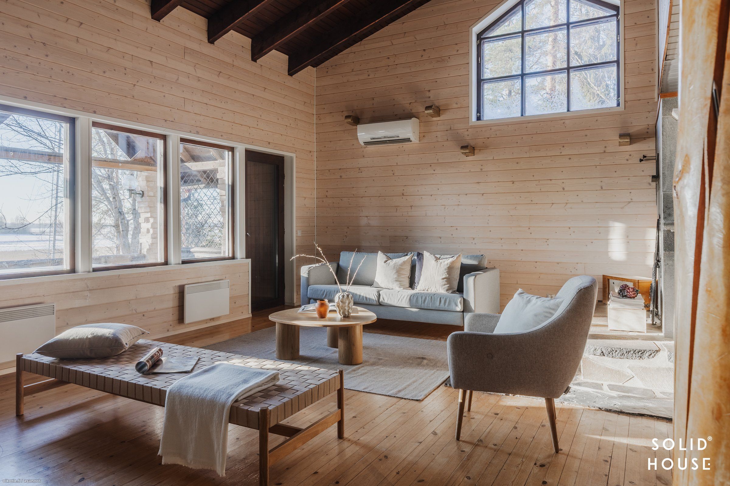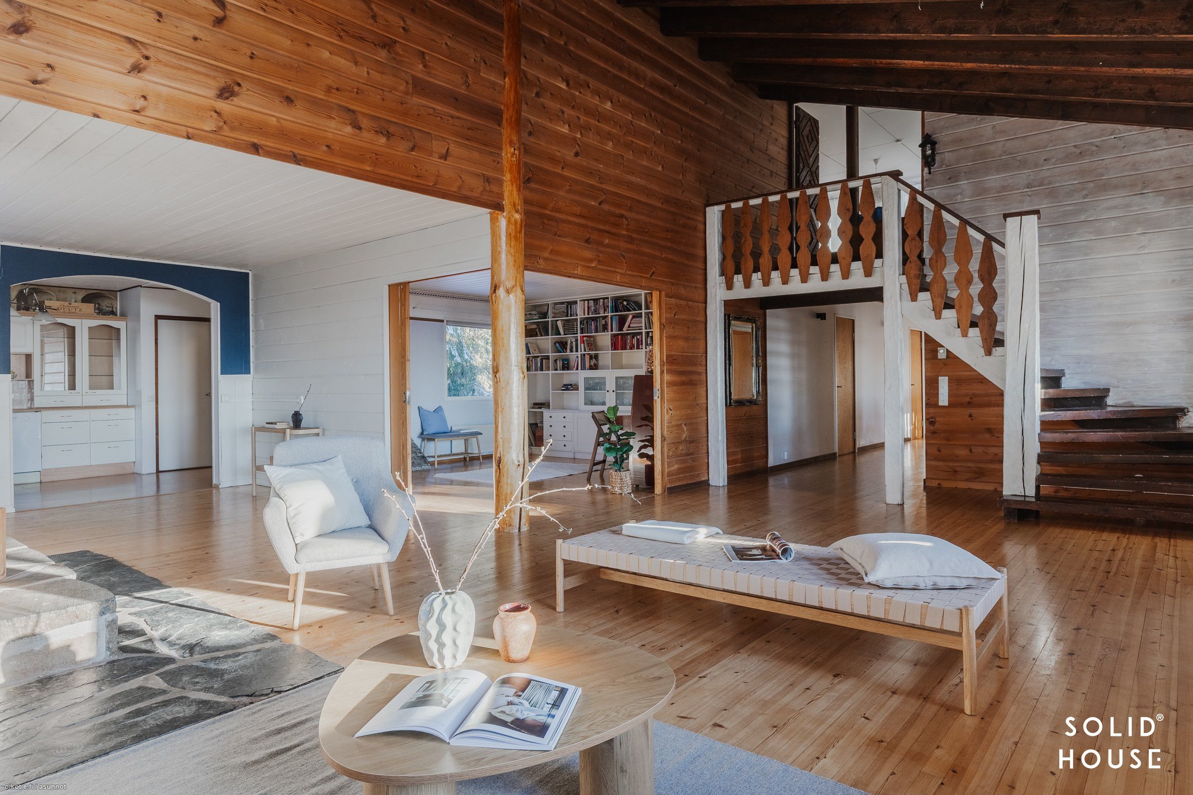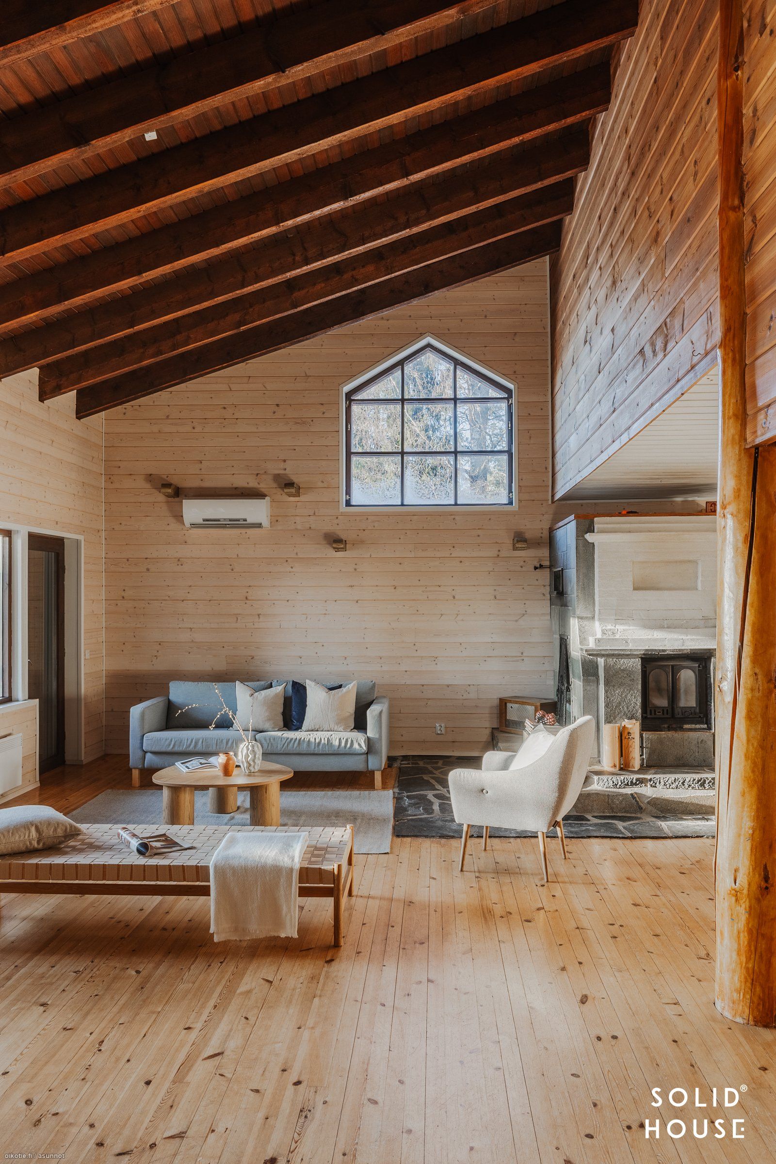 Talossa on viisi makuuhuonetta, joiden keskimmäisestä kerroksesta kuljet kauniita massiivipuupylväin varustettuja rappusia kohti päämakuuhuonetta – kokemus, joka jää mieleen. Yhdistetyssä ruoka- ja olohuone valtava varaava takka, joka jakaa tilan ja tuo lämpöä talven keskelle. Kesällä olohuoneesta avautuu käynti läpi talon mittaiselle parvekkeelle, josta voit ihailla laskevaa ilta-aurinkoa. Ylimmän kerroksen suuressa makuuhuoneessa on lisäksi oma parveke, jossa voit nauttia metsän rauhasta aamu kahvia juoden.