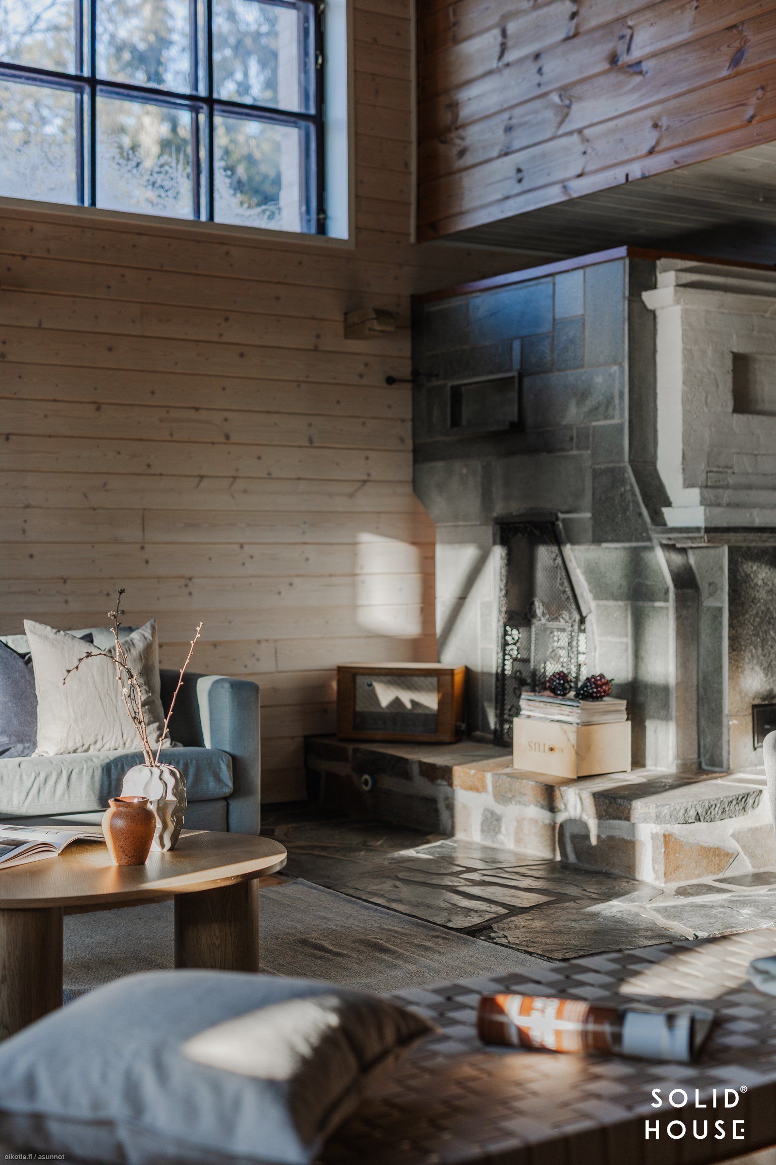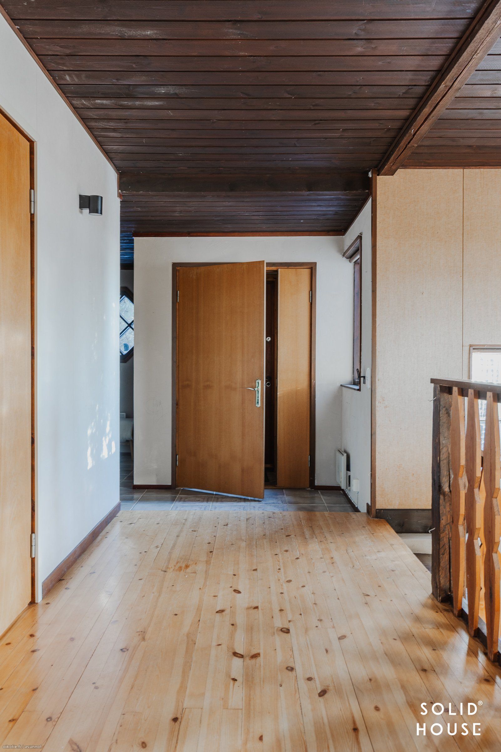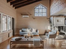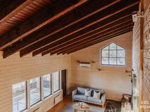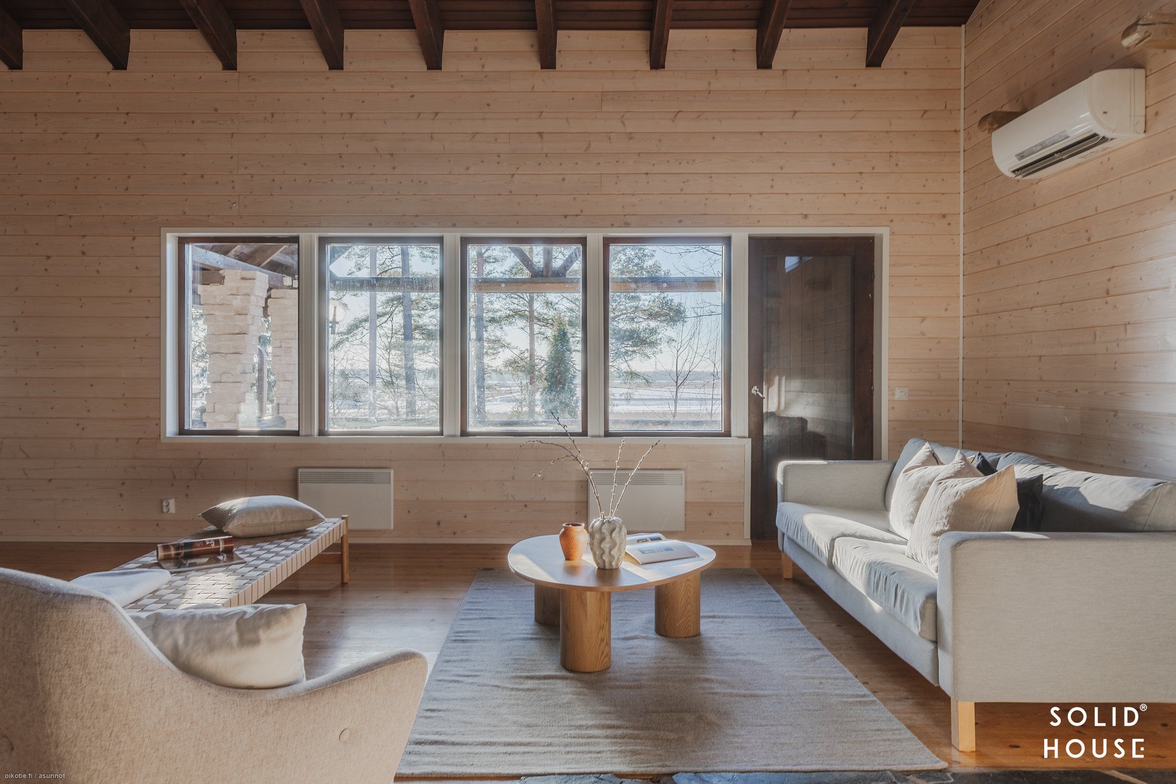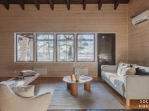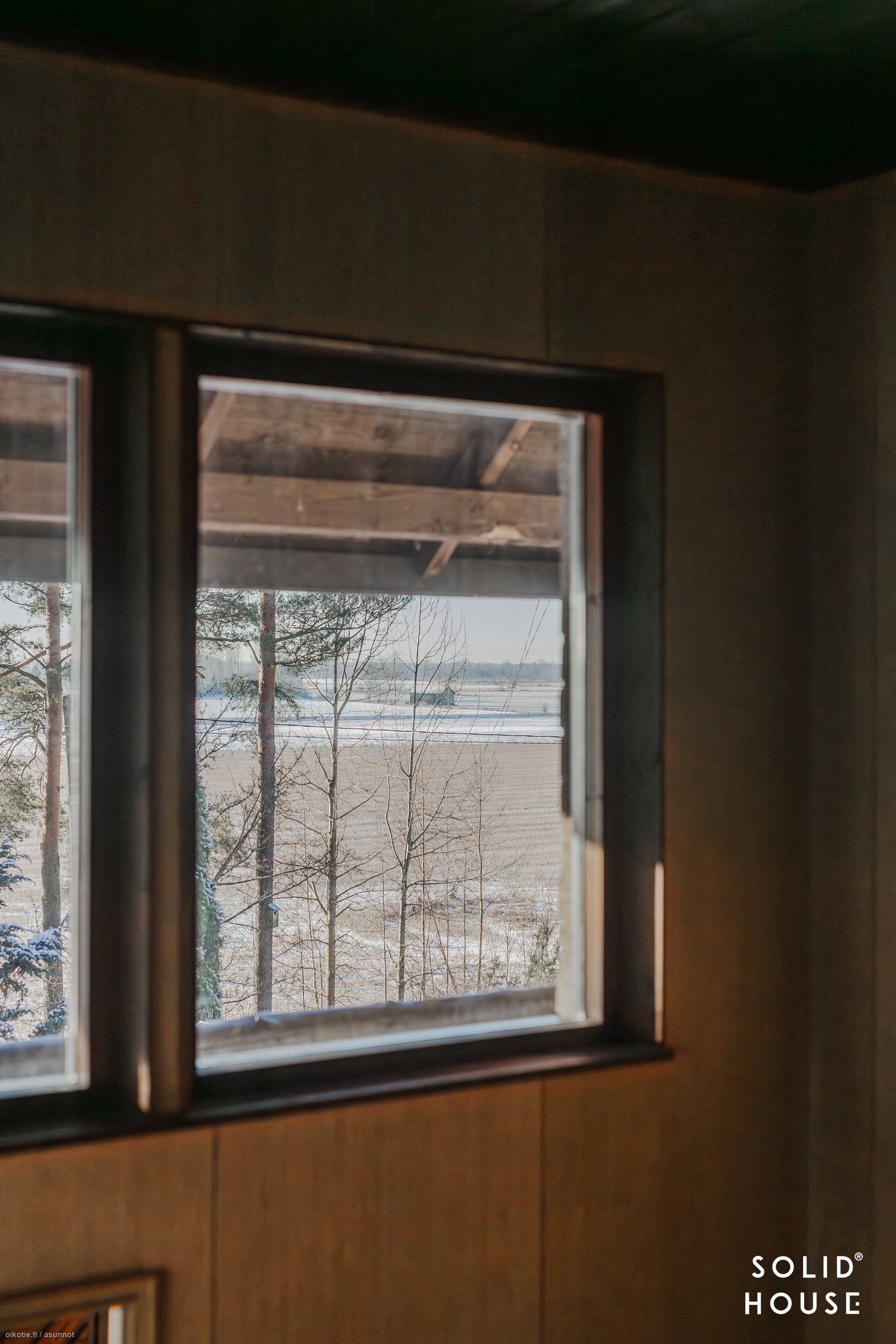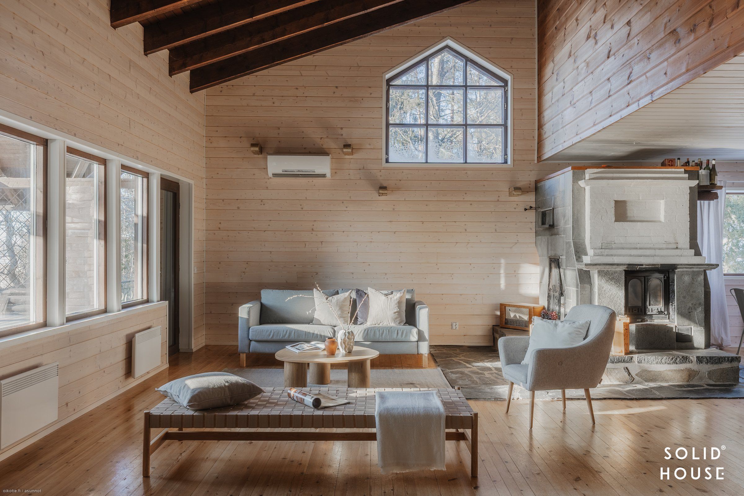 Talossa on viisi makuuhuonetta, joiden keskimmäisestä kerroksesta kuljet kauniita massiivipuupylväin varustettuja rappusia kohti päämakuuhuonetta – kokemus, joka jää mieleen. Yhdistetyssä ruoka- ja olohuone valtava varaava takka, joka jakaa tilan ja tuo lämpöä talven keskelle. Kesällä olohuoneesta avautuu käynti läpi talon mittaiselle parvekkeelle, josta voit ihailla laskevaa ilta-aurinkoa. Ylimmän kerroksen suuressa makuuhuoneessa on lisäksi oma parveke, jossa voit nauttia metsän rauhasta aamu kahvia juoden.