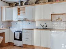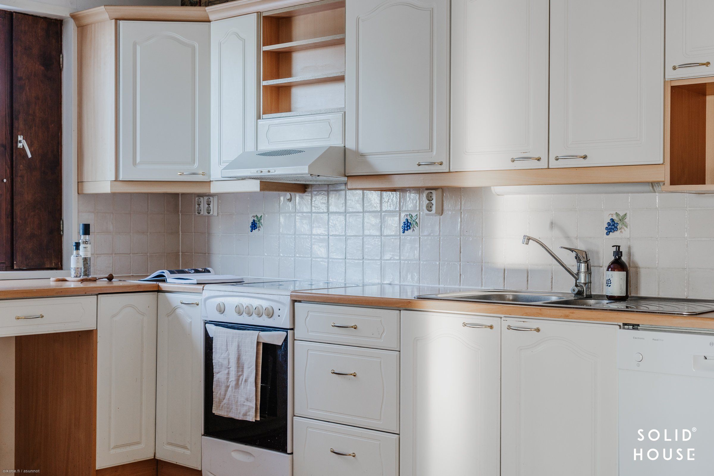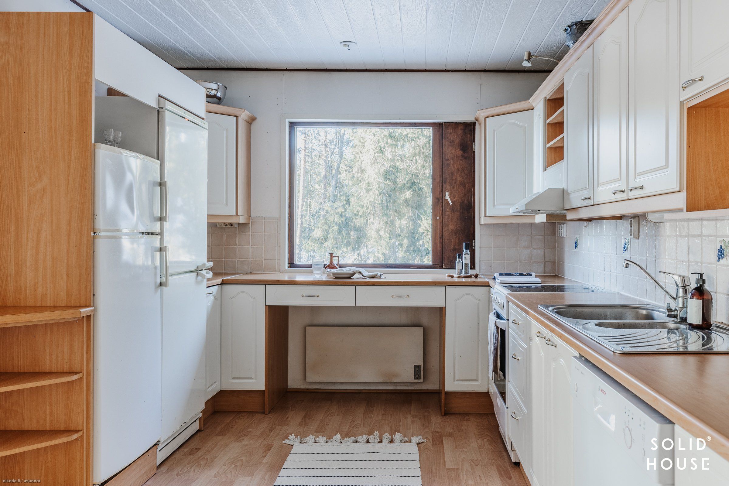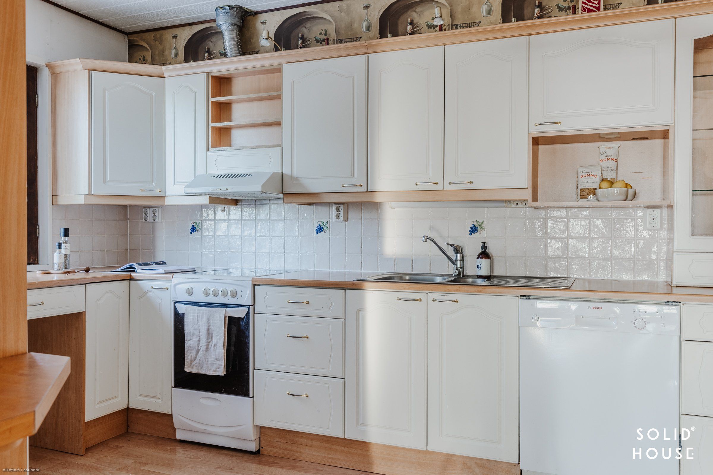 - Keittiön varusteet: Jääkaappi, jääkaappipakastin, uuni, liesituuletin ja astianpesukone. Liesi: Keraaminen liesi. Työtason materiaali: Laminaatti. Avara ja käytännöllinen keittiö, josta kulku suuren alkovin kautta yhdistettyyn ruoka- ja olohuoneeseen.
