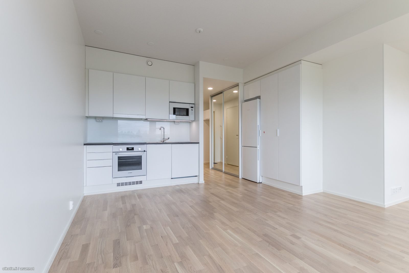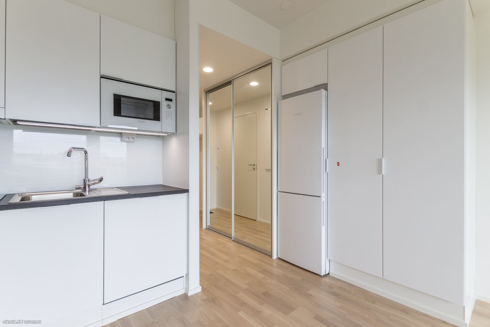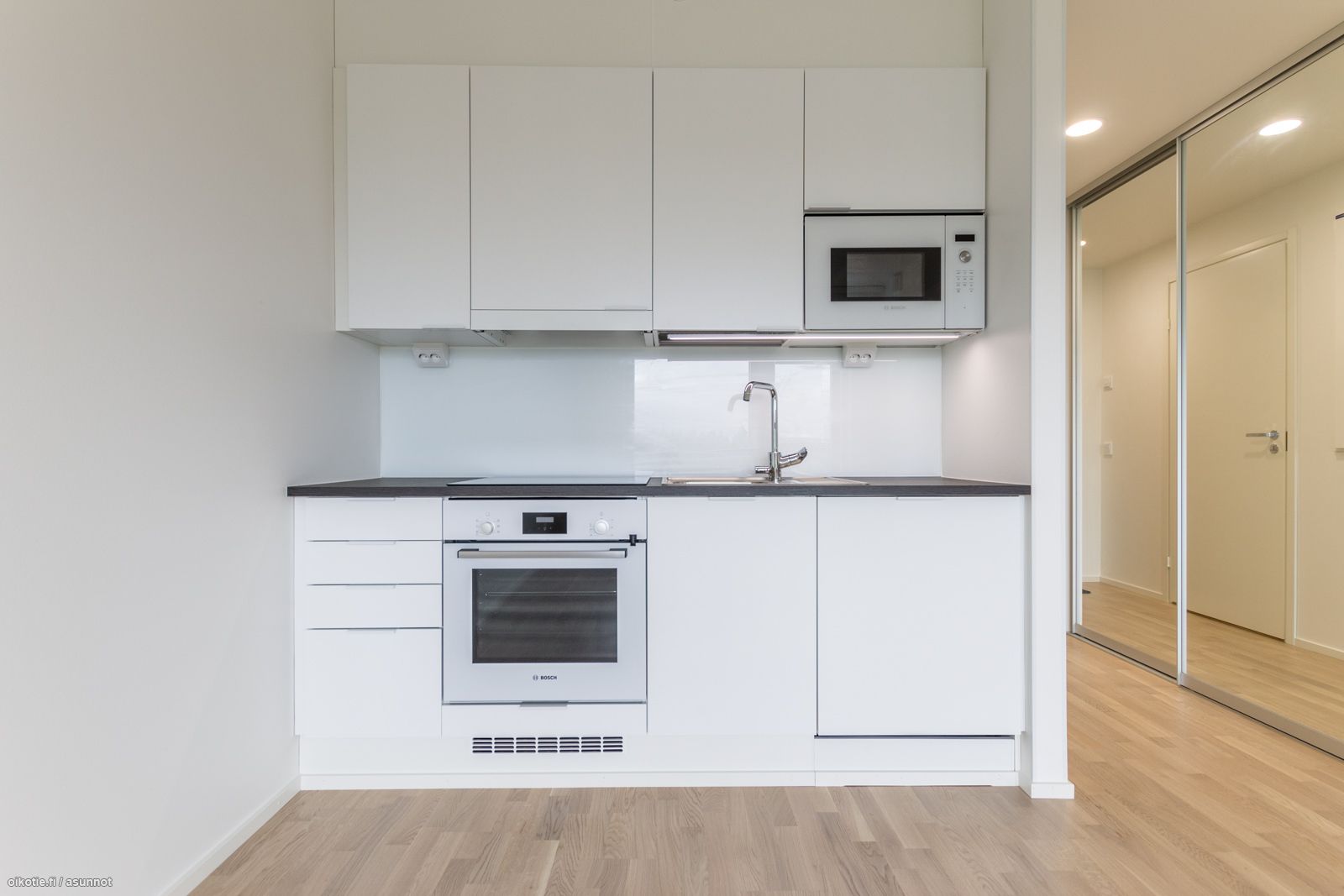 - Induktioliesitaso, kalusteuuni, liesituuletin, integroitu astianpesukone sekä mikroaaltouuni, jää/pakastinkaappi.