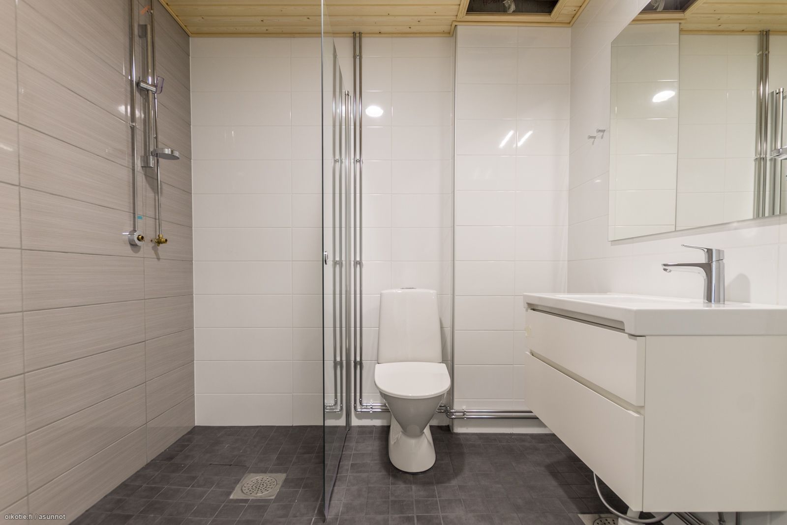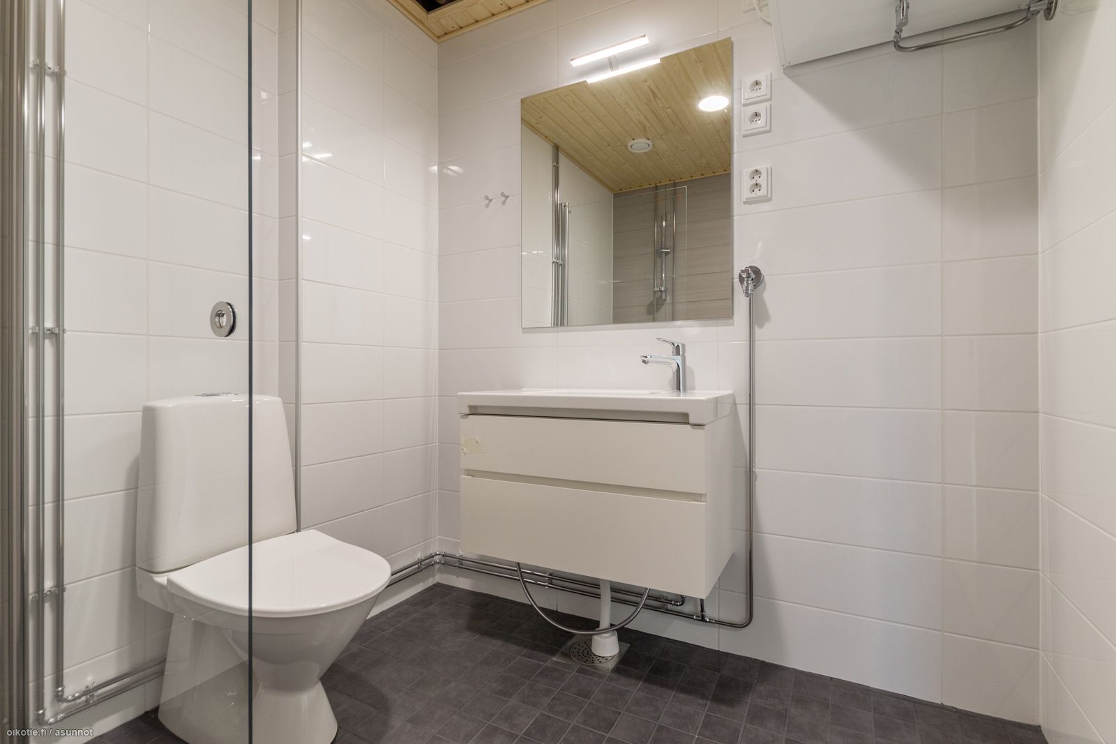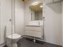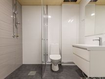 - Pesutilojen kuvaus: Laatoitettu, pesukoneliitäntä, mukavuuslattialämmitys, kääntyvä suihkuseinä.