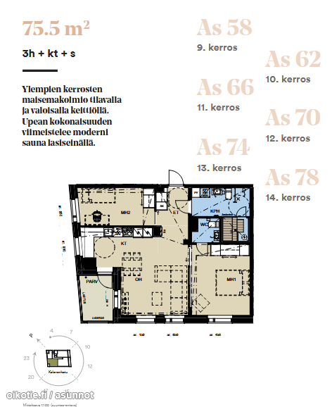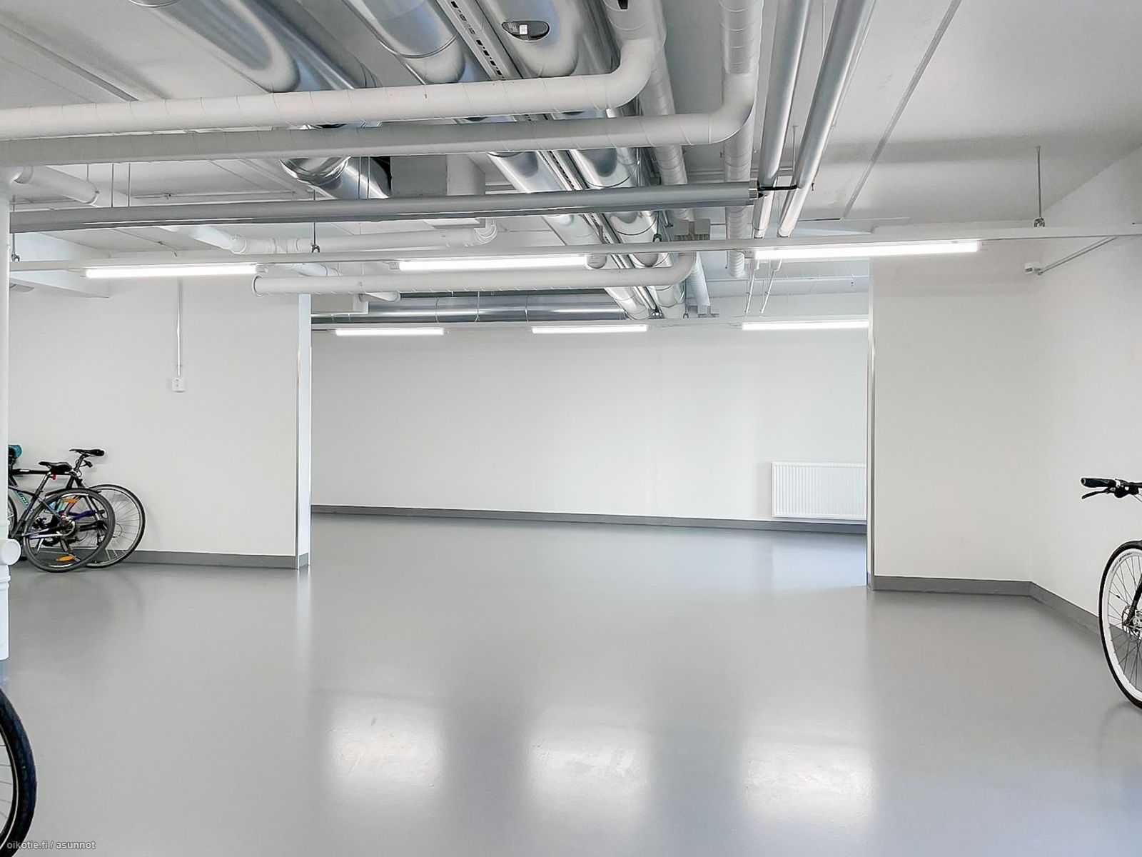- urheiluvälinevarasto, väestönsuoja, kaapeli-tv, Huoneistokohtaiset varastot, lastenvaunuvarasto. Taloyhtiössä muuta: Koneellinen tulo- ja poistoilmanvaihtojärjestelmä, lämmöntalteenotolla. Ilmanvaihto on 2.–8. kerroksissa keskitetty ja kerroksissa 9.–16. huoneistokohtainen. Yleiset tilat ja liiketilat toimivat omilla koneilla. Lämmityksenä kaukolämpö, lämmönluovutus asunnoissa termostattiohjatulla vesikiertoisella lattialämmityksellä, pesuhuoneissa on sähköinen mukavuuslattialämmitys. Viilennysmuotona kesäaikana toimiva lattiaviilennys. Huoneistot varustetaan sähköverkkoon liitetyillä, patterivarmistetuilla palovaroittimilla. Kiinteistö liitetään Elisan kaapeli-TV-järjestelmään ja varustetaan laajakaistan mahdollistavalla yleiskaapeloinnilla. Elisan laajakaistan nopeus on vakiona 10M.