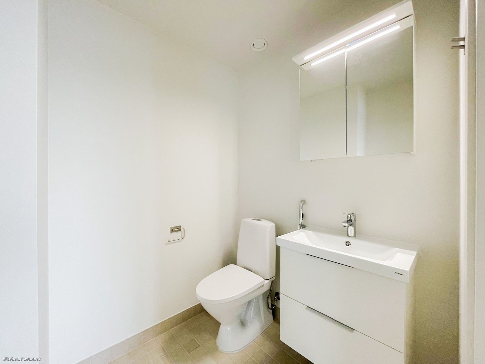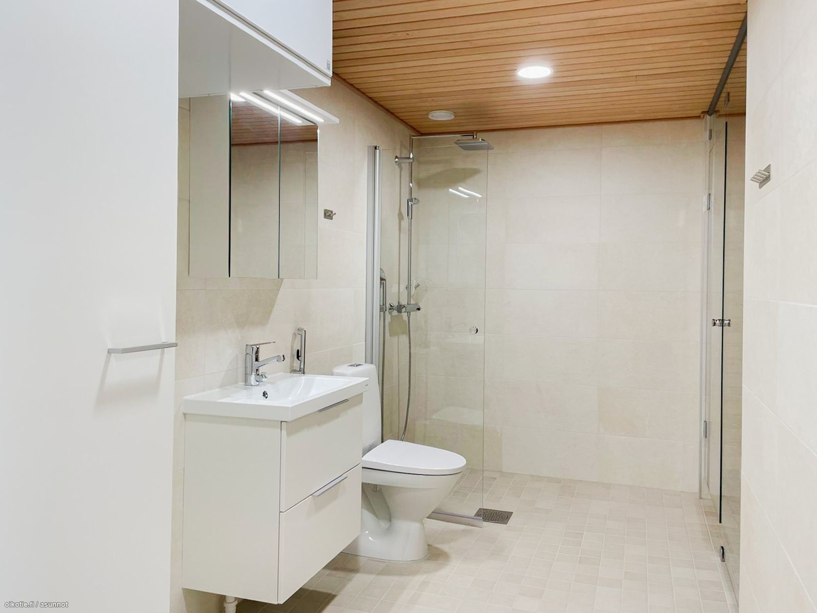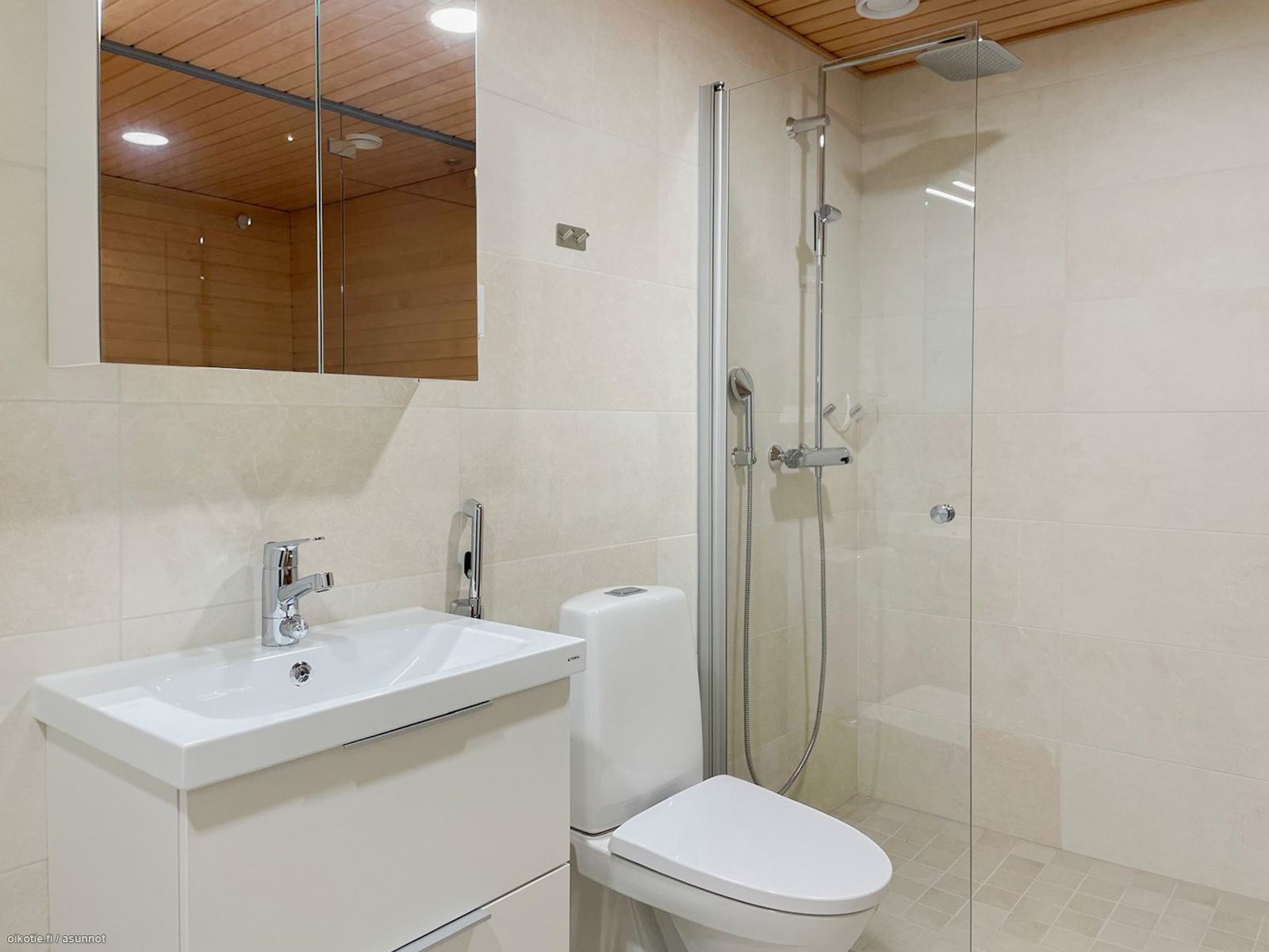 - Pesutilojen kuvaus: Kylpyhuoneessa pistorasialla varustettu valaisinpeilikaappi sekä allaskaappi. Kylpyhuoneessa on sähköinen mukavuuslattialämmitys. Kylpyhuoneessa on liitos- ja tilavaraus pyykinpesukoneelle ja kuivausrummulle. Varustus: suihkuseinä, pesukoneliitäntä, lattialämmitys, wc-istuin, suihku, peilikaappi, kiinteät valaisimet, kylpyhuonekaapisto. Varustus: bidee-suihku.