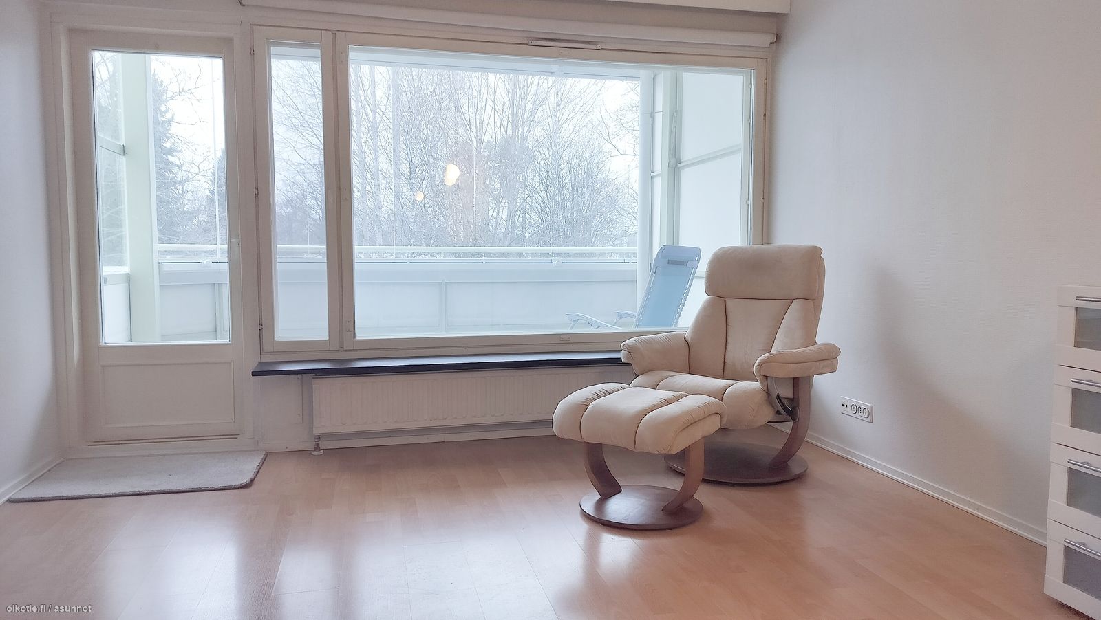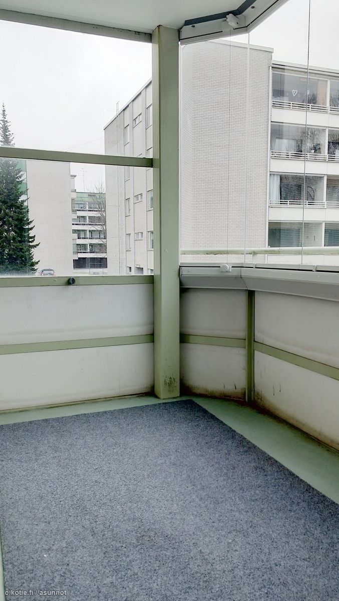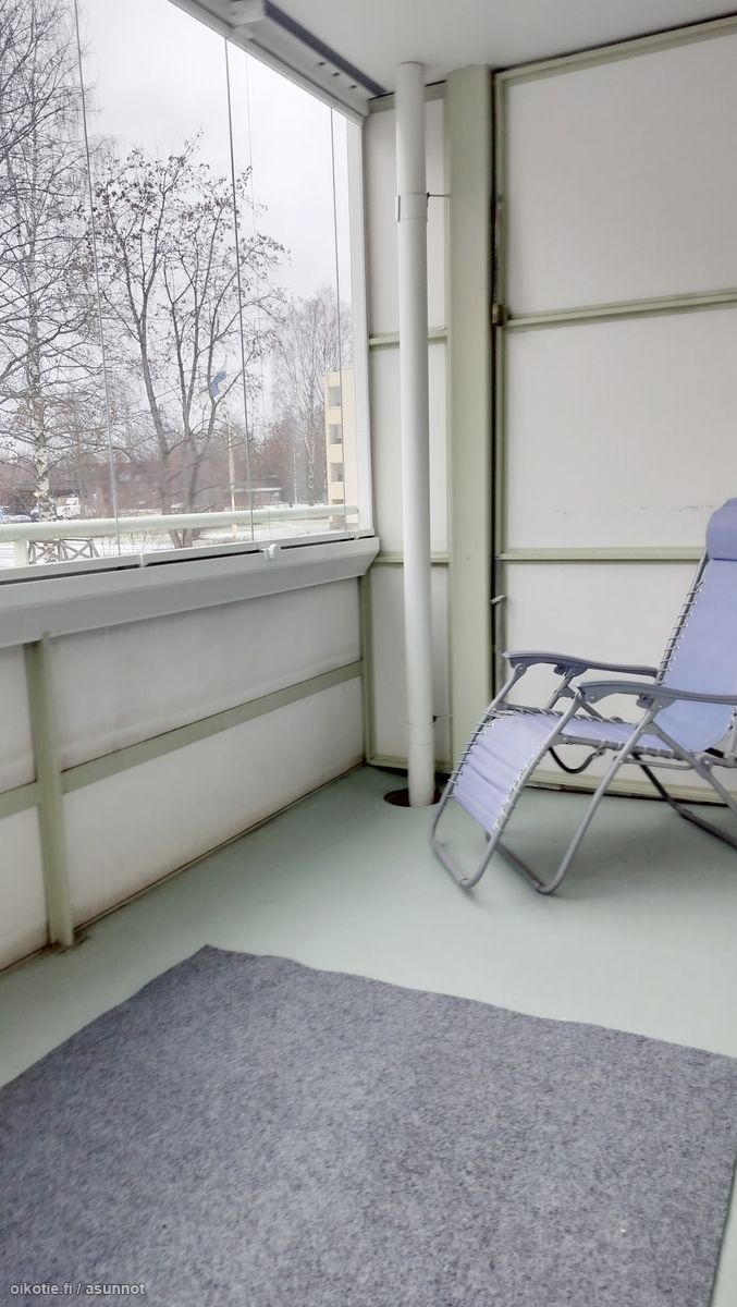 - Olohuoneesta käynti tilavalle, lasitetulle parvekkeelle. Maalatut seinäpinnat, laminaattilattia. Kaapistoja.