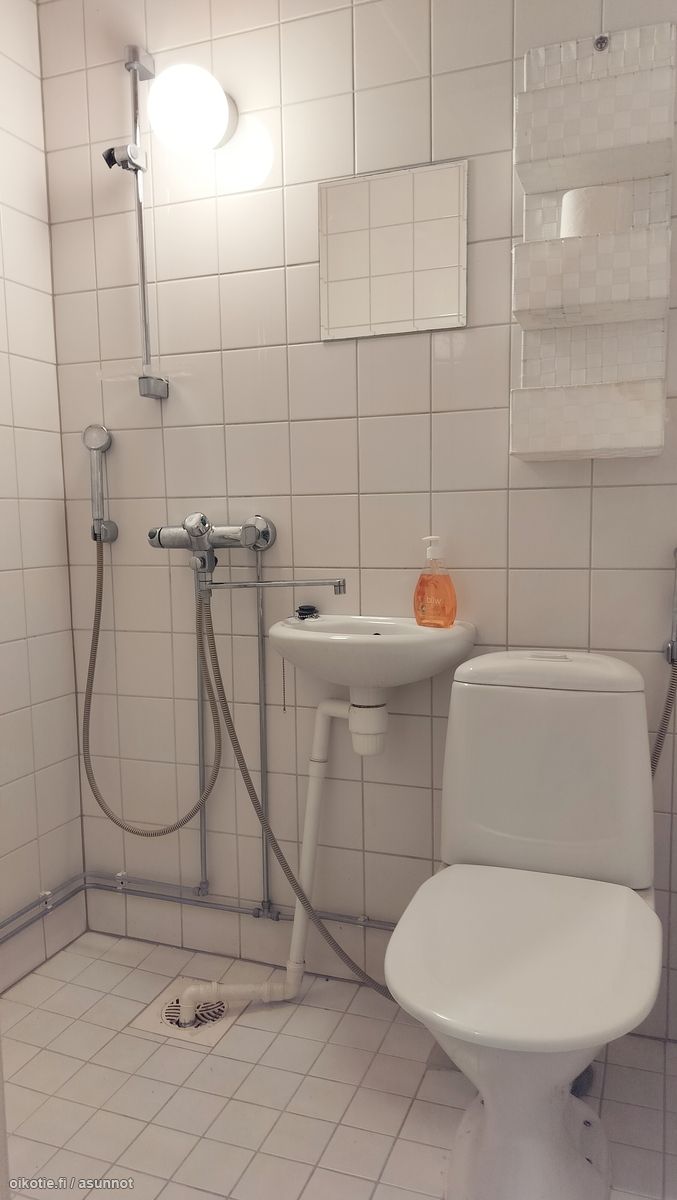 - Pesutilojen kuvaus: Kaakeloidut seinät, laattalattia. Suihku, wc, peili.
