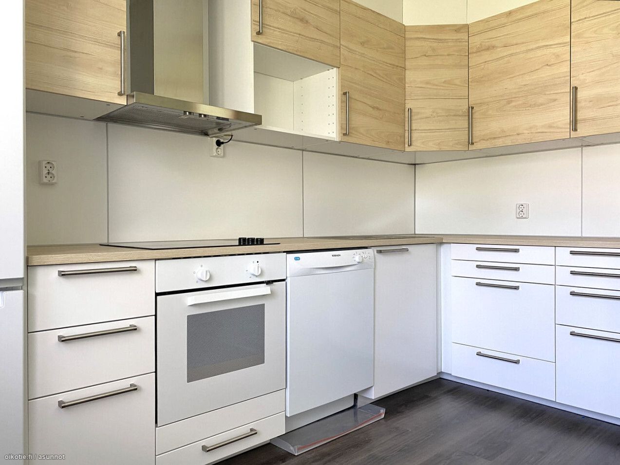 - Maalatut seinäpinnat, laminaattilattia. Varustusteina jääkaappi/pakastin, erillisuuni, liesitaso, liesituuletin ja astianpesukone.