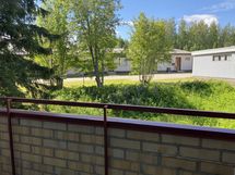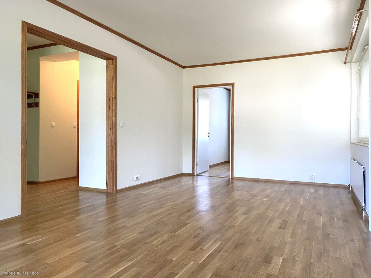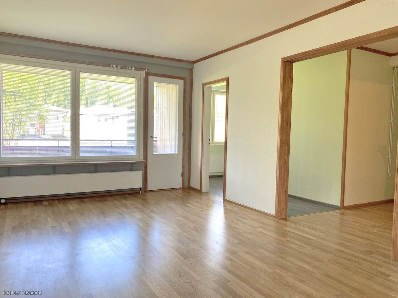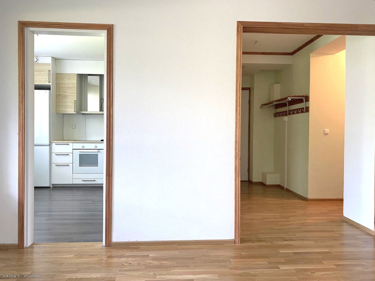 - Olohuoneesta käynti parvekkeelle. Maalatut seinäpinnat, lautaparkettilattia.